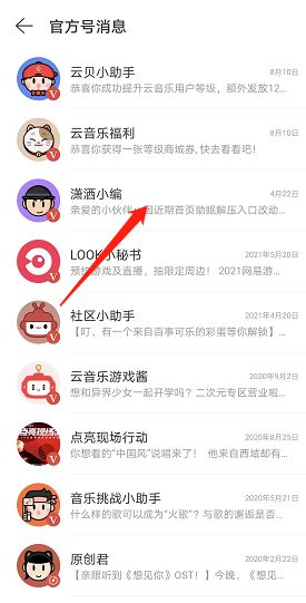 1、打开网易云音乐,然后选择上方的消息列表进入官方号。