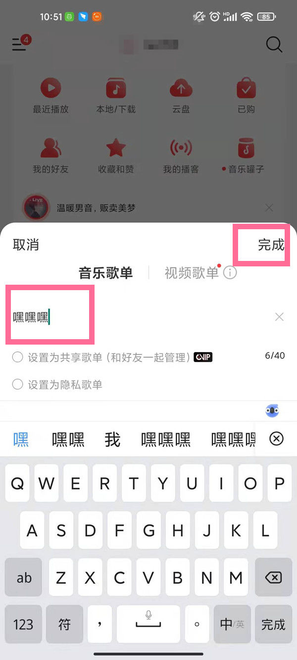 2、在创建歌单页面,填写自己喜欢的名字,点击完成。