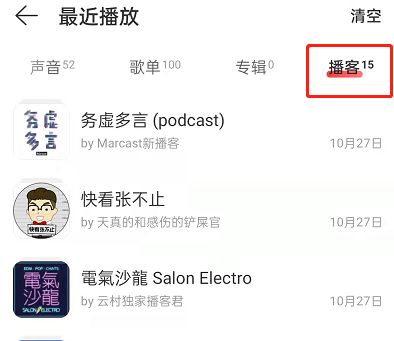 3、滑到播客,点击播客即可查看近期历史。