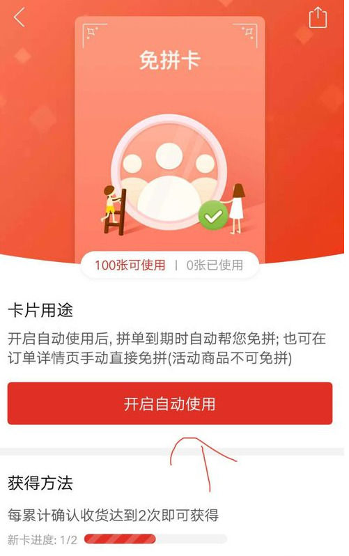3、另外点击免拼卡的话,大家还可以开启自动使用的功能,让你的拼单购物变得更加方便快捷,非常实用!