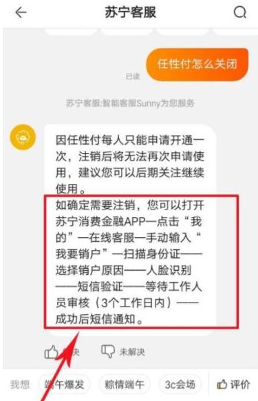 可以点击【在线客服】,输入问题后,如果要关闭的话,需要现下载【苏宁的 金融 app】,在其中选择注销后,注销后,需要人工审核后,成功后短信通知你。