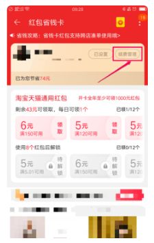 1、首先打开淘宝:点击【我的淘宝】,点击【红包省钱卡】。