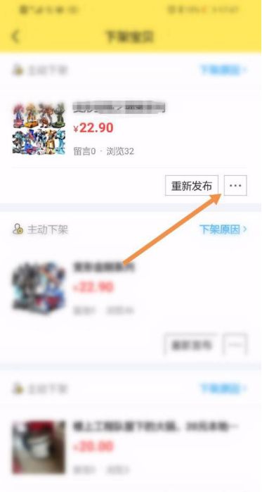 第四步:选择需要删除的宝贝,点击重新发布旁边的三个点点