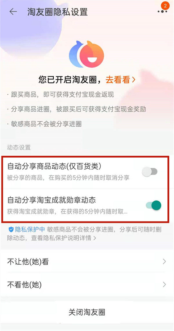 4、下方有自动分享商品动态和自动分享淘宝成就勋章动态两个设置,用户根据需要点击关闭就能取消分享了。