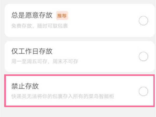 3、选择菜鸟智能柜,选择禁止存放并确认设置即可。