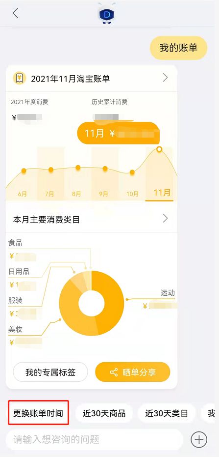 5、在下方输入我的消费账单,或者直接点击我的淘宝账单,就能查看到如下图所示的账单,点击“更换账单时间”或者“专属标签”等按钮就能查看相应报告数据。