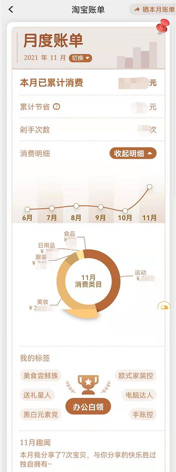 另外,用户们在 阅读 账单页点击展开明细,也能获得如下图所示的购物分析。