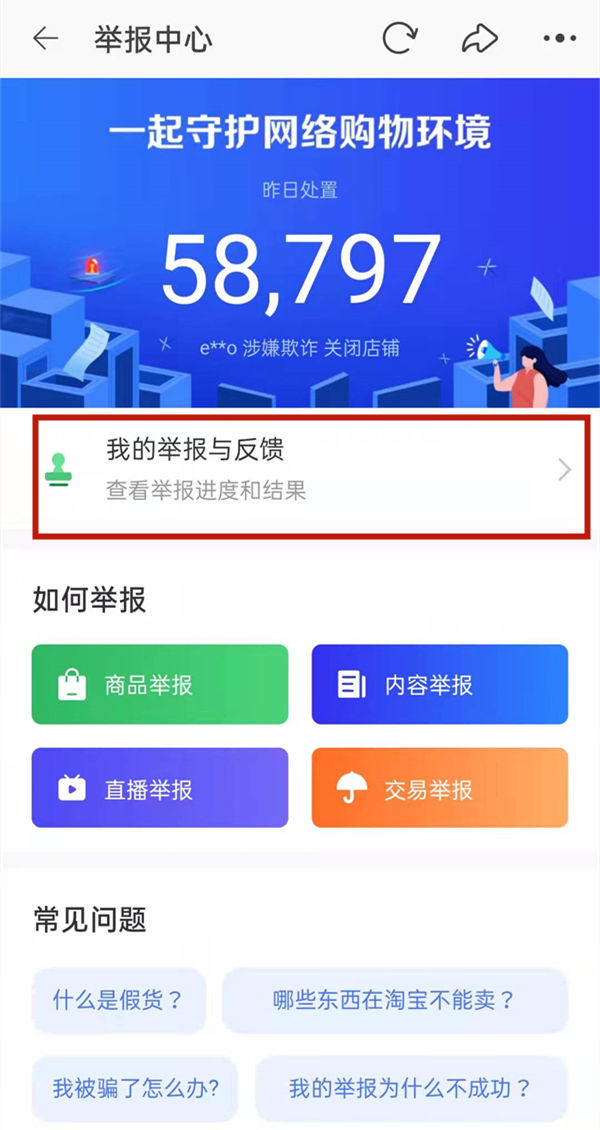 3、点击 我的举报与反馈 即可查看。