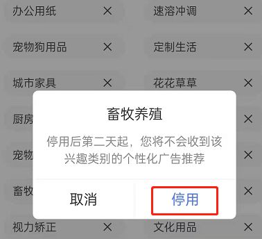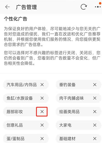4、接下来就会看到各种类型的商品,可以选择您不想看到广告的商品,点击右侧x号进行屏蔽。