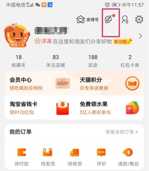 2、点击我的淘宝,如下图,看到淘宝换肤