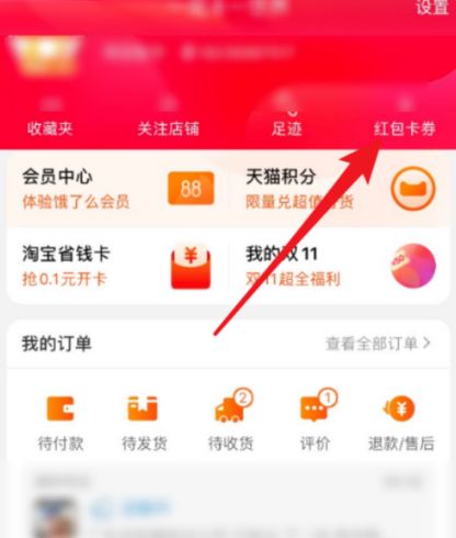 3、在我的淘宝页面上,找到【红包卡券】入口,点击进入它
