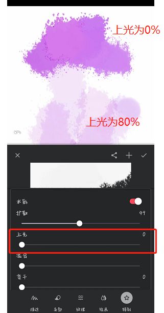 有些特殊笔刷默认有重叠颜色效果,实际上我们可以自己修改参数。比如水彩画笔中的轻洗画笔就是这样的。您可以打开笔刷设置。在下面的特殊栏中,设置抛光参数。当抛光设置为80%时,我们的着色会有重叠的颜色,这与压力和不透明度无关。如果我们完全不需要重叠色效果,可以将抛光参数设置为0,这样就不会有重叠色了。