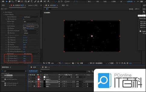 10.选择创建好的【纯色图层】,然后在【Particular】的编辑面板中选择【发射器】修改为【连续】,在【发射器类型】中修改为【盒子】,并且调整【粒子数量】,在【发射器大小】面板中调整【X/Y/Z】轴的数值。