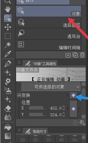 单击左侧工具栏中的操作工具,操作子工具面板中的对象工具,以及对象工具属性面板中变换选项后面的小菱形图标。