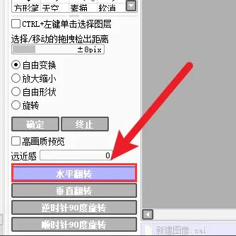 选择复制的眼睛层,按键盘上的“Ctrl T”快捷键。选中眼睛后,点击面板中的“水平翻转”按钮,画布中的眼睛就会翻转。