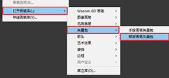 单击“画笔预设”窗口右上角的菜单按钮,然后从列表中依次选择“画笔库-矢量包-打开退化画笔矢量包”选项以打开笔触样式选择窗口。