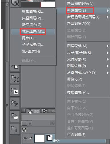右键单击图层面板中的纸张图层,在弹出窗口中单击“新建图层”,然后在二级窗口中单击“纯色填充”选项。
