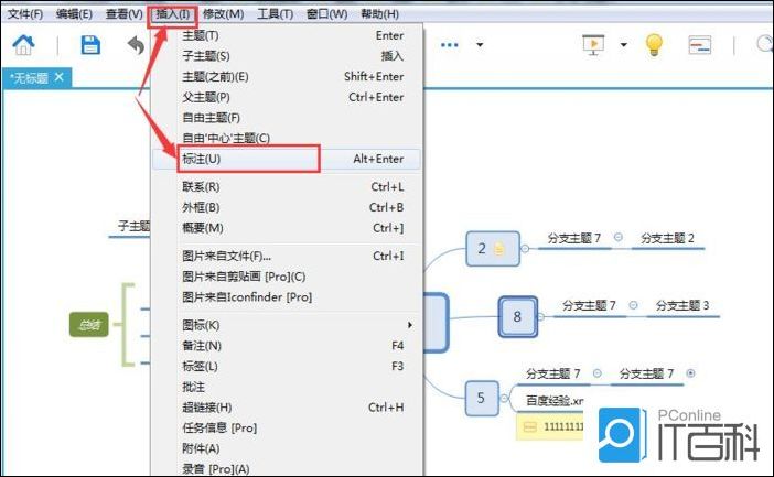 3、然后点击插入——标注,那么在思维导图上就会出现有一个标注选框了