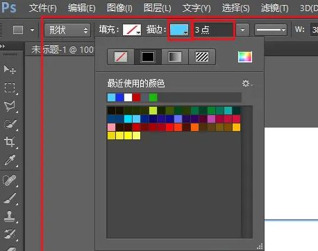 打开ps软件,按“Ctrl N”快捷键新建一个画布,点击左侧工具栏中的“矩形工具”,在画布中绘制一个矩形;点击“填充”右侧的颜色按钮,在弹出的窗口中点击无色填充,然后点击“笔画”右侧的图标选择自己喜欢的笔画颜色,再点击“3点”右侧的下拉按钮选择合适的笔画粗细。