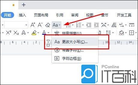 在“开始”菜单栏点击“拼音指南”右侧倒三角图标,选择“更改大小写”。
