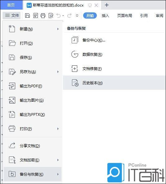 打开某一个文档,点击文档左上角「文件」-「备份与恢复」。