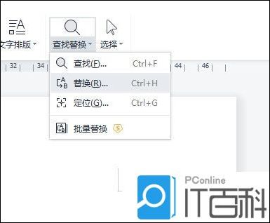 首先我们点击上方菜单栏“开始”--->“查找替换”--->“替换”。