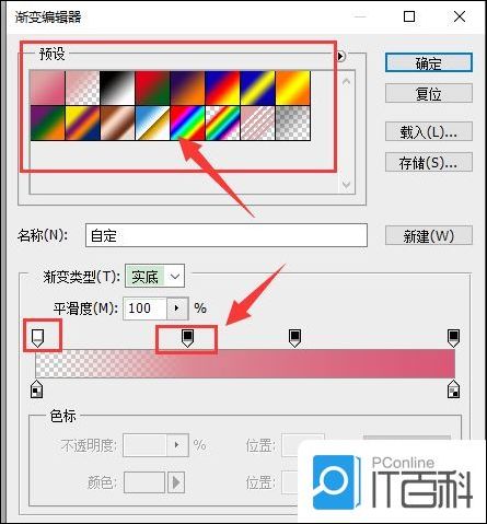 4、你可以在预设处选择你渐变颜色的方式,在底下的渐变颜色处可以拉动上下的色标进行设置颜色的长度,也可以自己加几个色标进去改变颜色