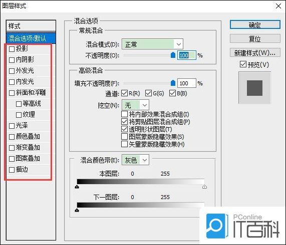 4、接着点击“混合选项”进入一个“图层样式”窗口,然后共有十二个字体样式选择:投影、内阴影、外发光、内发光、斜面和浮雕、等高线、纹理、光泽、 颜色 叠加、渐变叠加、图案叠加、描边