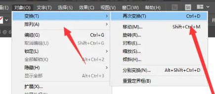 6.然后选中复制的图像,点击菜单栏中的“对象”选项,在弹出的下拉框中点击“变换”和“再次变换”,或者点击“Ctrl D”快捷键。图像将被再次复制,并且复制的图像的距离和角度是相同的。