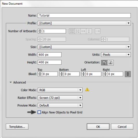 启动AI软件,点击文件新建,新建一个文档,将画布宽度设置为600,高度设置为400,单位设置为像素,颜色模式设置为RGB,取消选中将新对象与像素网格对齐/新对象与像素网格对齐选项。