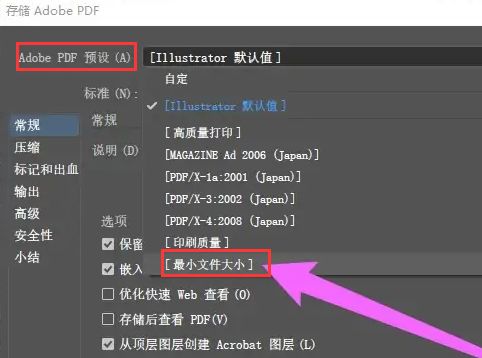4、然后AI界面会显示“保存Adobe PDF”对话框。 单击“常规”选项,并将“Adobe PDF预设”选项设置为“最小文件大小”。