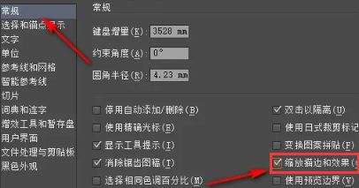 4.然后弹出“首选项”对话框,转到“常规”界面,并在右侧的常规面板中选择“缩放描边和效果”选项。