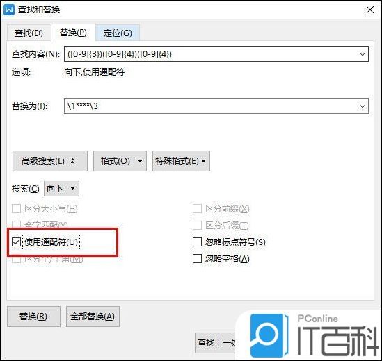 在查找内容中输入([0-9]{3})([0-9]{4})([0-9]{4}),在替换为中输入\1****\3,并勾选高级搜索里面的“使用通配符”。