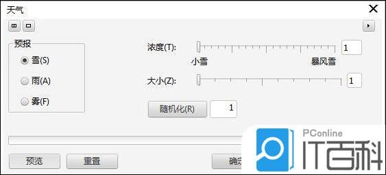 三、在弹出的窗口设置天气类型、浓度和大小,有雪、雨、雾三种效果,浓度是分布密度的浓度,大小是图片中个体的大小,如果不知道该怎么做也可以直接点击【随机化】让系统来做选择