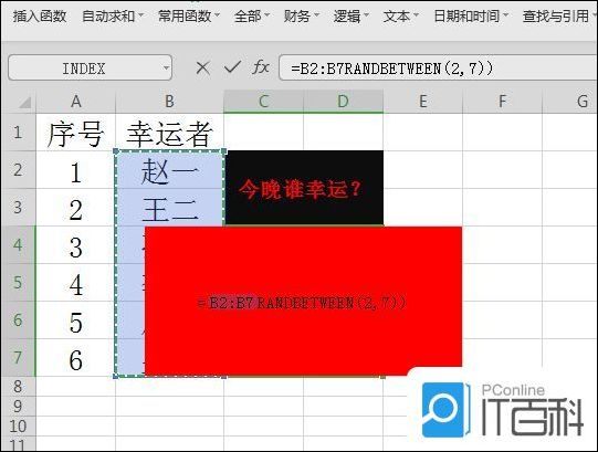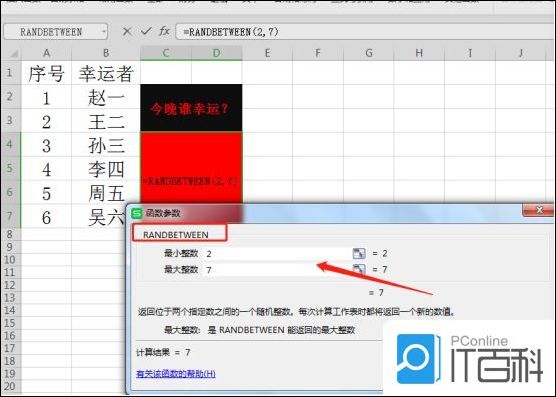 3、接着在红色区域中输入randbetween函数,设置第一行为2,最后一行为7,如下图所示。