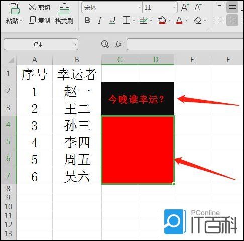 2、接着对右边的单元格进行合并,将今晚谁幸运填充为黑色,并将下方的单元格合并填充为红色,如下图所示。
