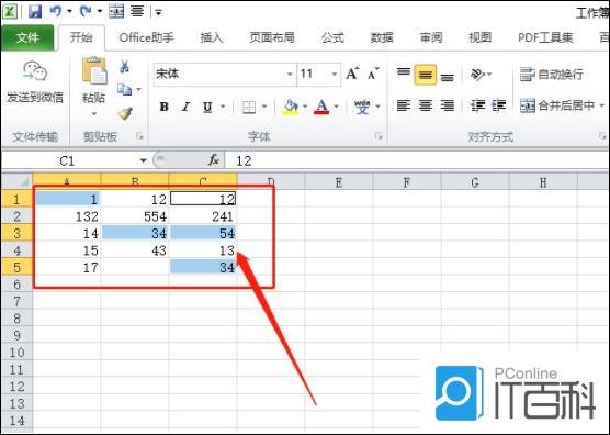 3.也可以使用ctrl键快速选中区域,按住【ctrl键】,可以隔着选中单元格。