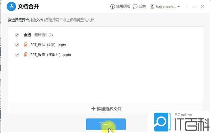 在弹出的「文档合并」弹窗界面,添加好需要合并的其他文档,点击「下一步」。