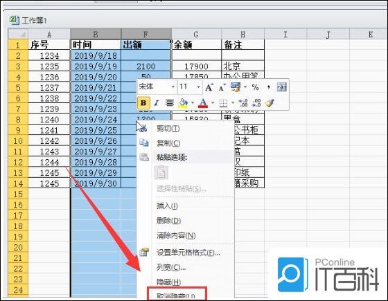 2、然后鼠标右键选择取消隐藏就可以将隐藏的行列内容显示出来了