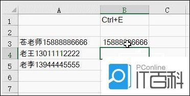 要从字符串中提取常规部分字符,输入要提取的第一个字符,按住CTRL并按E, Excel将自动找到该模式并使用现有示例填充它。