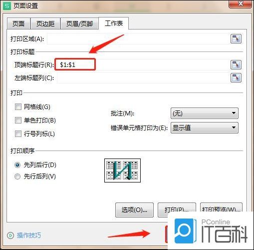 3.弹出页面设置对话框,切换到“工作表”,在“打印标题——顶端标题行”的右边,有一个拾取框,点击它。