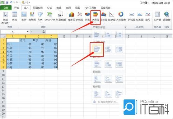 2.然后点击【图表】,有多种图表类型,选择需要插入的图表,这里选择的是条形图,如下图红色圈出部分所示: