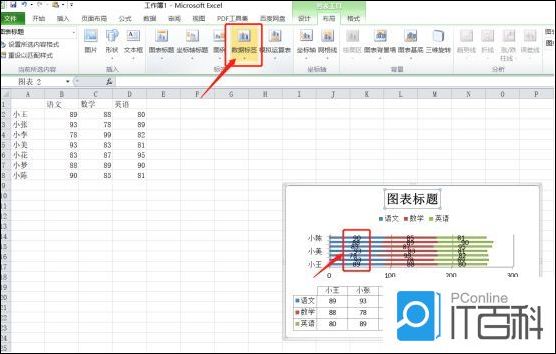 6.最后,在布局的菜单栏下边点击【数据标签】,可以把数据显示在上边,还可以修改图例和坐标轴标题等等,如下图红色圈出部分所示: