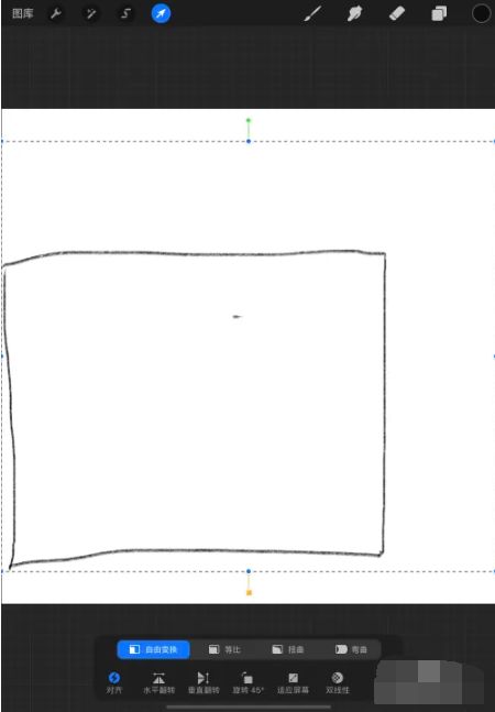 打开 procreate 软件,新建一个画布,在画布上画一个矩形,然后点击左上角的“箭头”图标,点击“自由变换”——“适合屏幕”。刚刚绘制的矩形将自动缩放到适当的大小