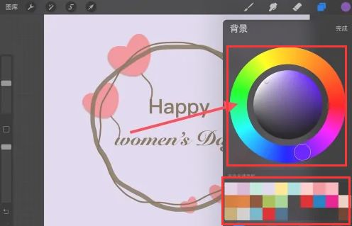 3.接下来,将弹出“背景”颜色选择窗口。在色环中选择一种喜欢的颜色作为背景色。如果不喜欢在色环里选,也可以在色卡里选自己喜欢的颜色。选择后记得点击“完成”按钮;