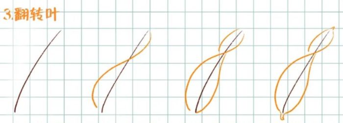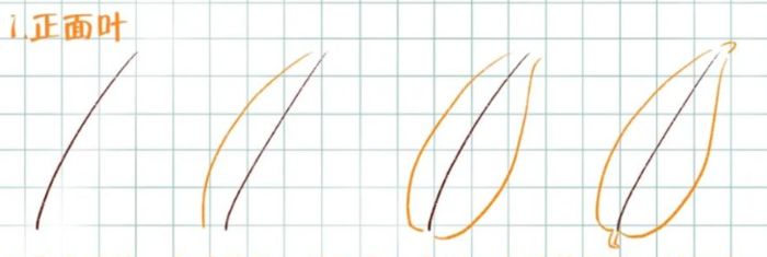 同样,先画主脉,从脉根到脉尖画一个“S”形,再从反方向画一个“S”形,再画叶尖和叶柄。