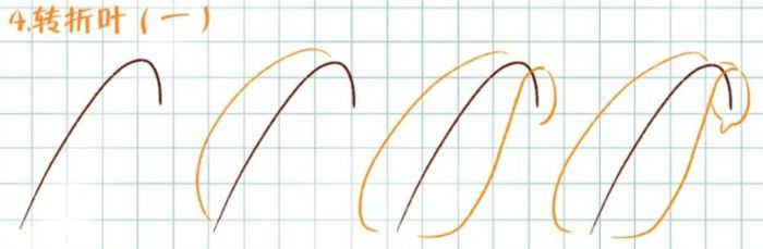 画一个弧形作为主脉,沿着叶脉画一个“C”形作为叶片的一边,然后沿着叶脉的方向在叶脉的另一边画一个“S”形,最后画叶尖和叶柄。