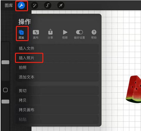 第二步:直接点击左上角的【操作】-【添加】,选择【插入照片】选项。界面会自动跳转到设备的相册,选择预先保存的参考图片导入,如图: