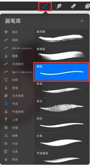 3 .选择新图层,在画布上单击“画笔”图标,然后在打开的画笔库中单击“单线”选项,进入“画笔工作室”界面。