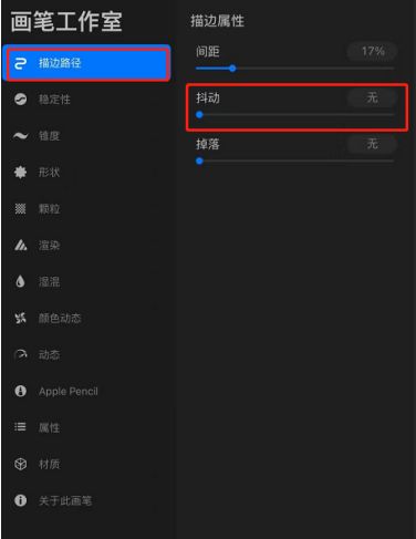 要在 procreate 软件中设置画笔描边抖动功能,必须一次设置一个画笔,但并不意味着可以设置一个画笔参数来使用其他画笔。